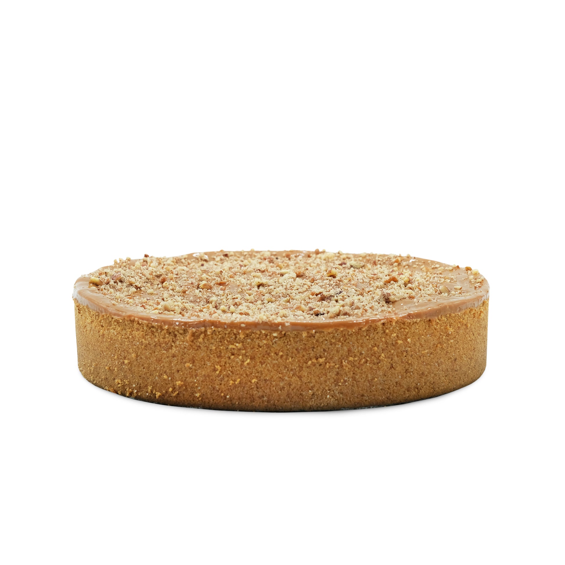 Oplev den lækreste kombination af sprød kiksebund med en luftig, bagt vanilje cheesecake, toppede med et tykt lag af hjemmelavet karamel og pekannødder